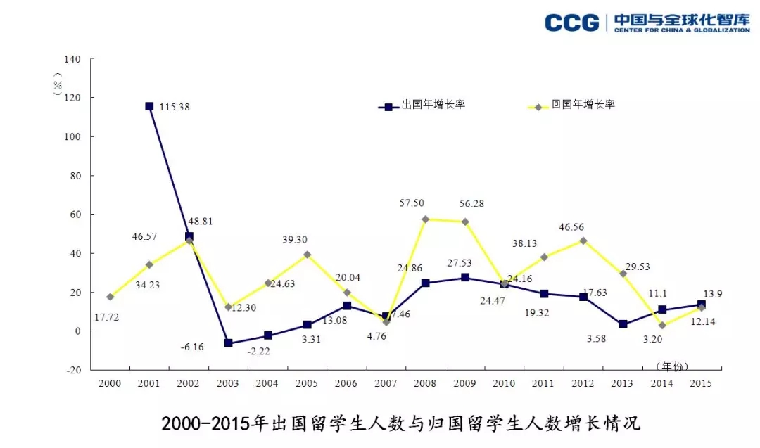 2000-2015 中国留学生人数和归国留学生人数增长情况 / 中国留学发展报告 (2016)