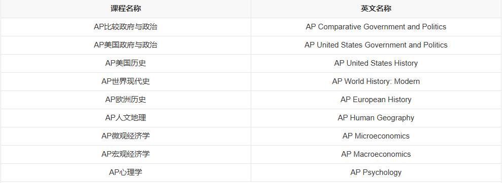 AP 历史与社会与科学类 课程共有9门,涵盖政治、历史、地理、经济、心理等领域,以下为具体信息。