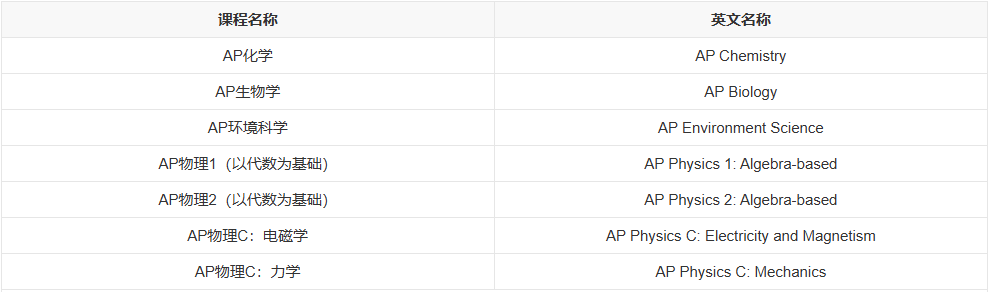AP 自然科学类 课程共有7门,涵盖化学、生物、物理、环境科学等领域,以下为具体信息。