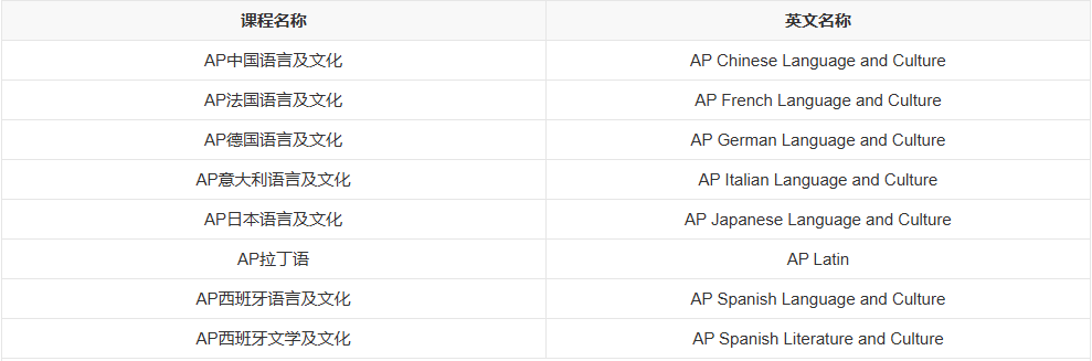 AP 世界语言及文化类 课程共有8门,涵盖汉语、法语、德语、意大利语、日语、拉丁语、西班牙语等7个,以下为具体信息。
