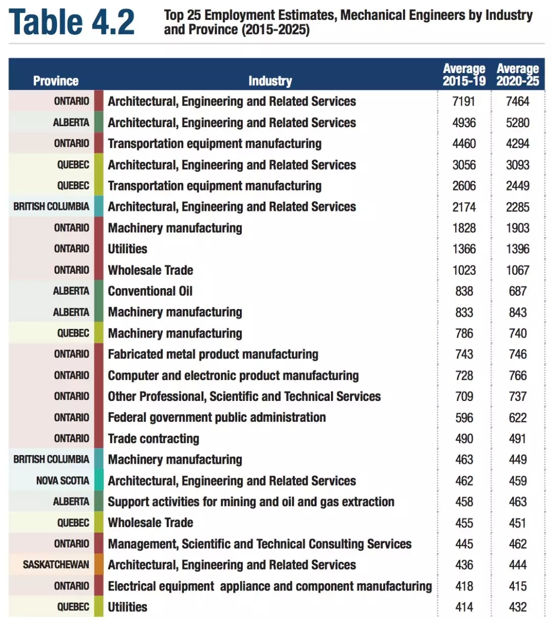 从该表格可以看出,机械工程师会集中从事 建筑、工程和相关服务行业 ,他们大部分人会在安大略省、艾伯塔省和魁北克省工作。同时,还有一大部分的机械工程师会 在安大略省从事运输设备制造业工作或机械制造业 。