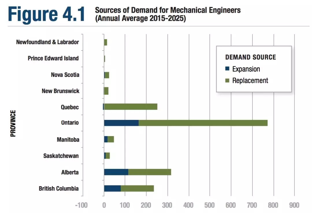 在加拿大工程协会的报告中,最引人注意的就是机械工程专业在加拿大各省的就业岗位预测。可以明显看出, 安大略省的就业岗位远远超出其他省份高居榜首。