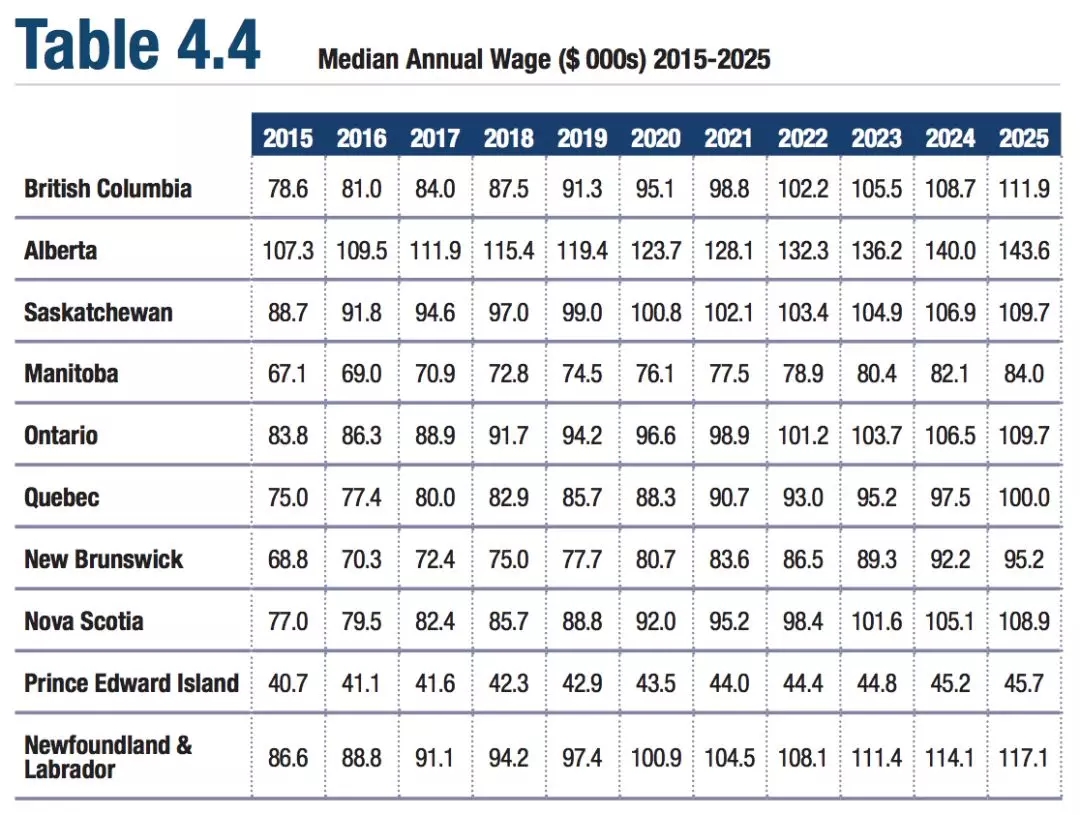 加拿大工程协会的报告提供的另一张重要表格,是机械工程行业的平均薪资情况,安大略省的数据也是非常突出哦!
