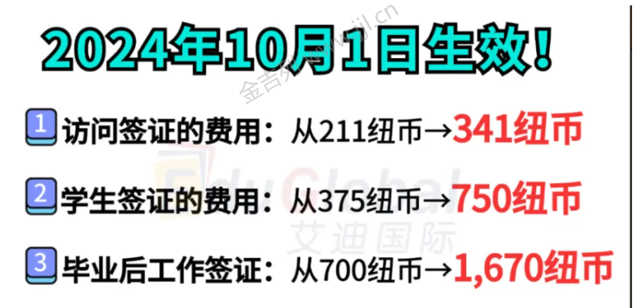 访问签证的费用: 将从211纽币→ 341纽币 学生签证的费用: 更是从375纽币→ 750纽币 毕业后工作签证: 700→ 1,670纽币