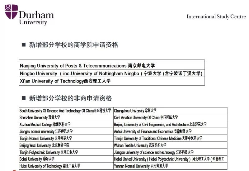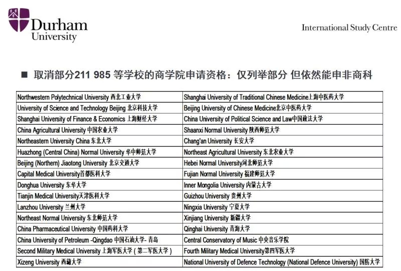 杜伦大学,英国老牌名校, 2019年QS世界大学排名74位。最近商学院公布将于2019年1月31日结束部分国内985/211大学的申请资格与最新入学要求。被取消的大学排名前50的有西北工业大学、北京科技大学、上海财经大学、中国农业大学、东北大学、华中师范大学、东华大学、首都医科大学、北京交通大学、南方科技大学。详情