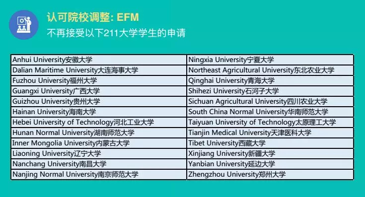 认可院校调整,不再接受以下 24所211大学申请: