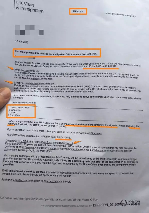 学生在入境英国之后,需要在 10天之内去指定的邮局领取生物信息卡(BRP),该卡片会注明申请人完整的签证有效期以及其他相关身份说明和条款。如果入境时间距离30天入境签证的失效日期少于10天,需在30天入境签证失效前领取BRP卡。(领取地点和可领取时间在文件中标注)。为更快捷的领取BRP卡,建议学生携带这封“UKVI 07”说明文件。