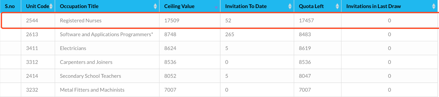 根据澳大利亚移民局发布最新财年配额清单,护理的配额是最高,但使用率非常少。所以申请移民的比较大概率的事情。如图下显示
