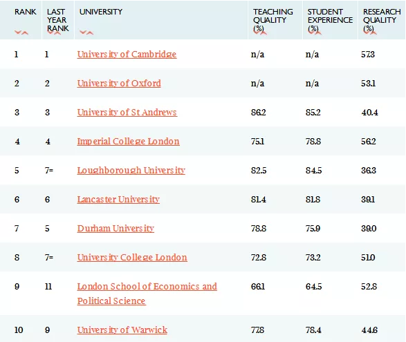 今年夺冠院校与去年一模一样,就是 剑桥大学 !恭喜剑桥卫冕成功!而更有趣的是,今年前四的名次居然一点儿没变,在剑桥之下稳稳坐着牛津、圣安德鲁斯、帝国理工。