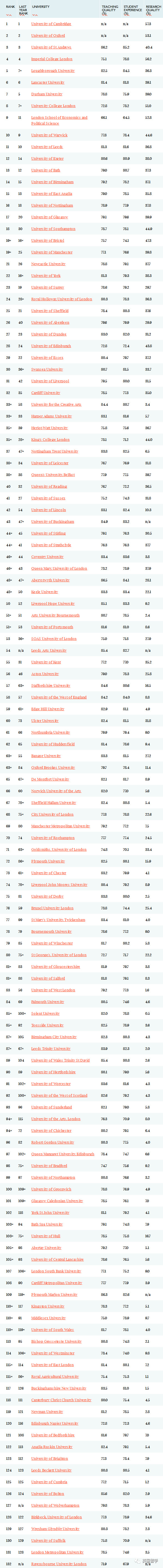 很戏剧性的,去年排名第七的拉夫堡和第五的杜伦今年刚好调换了位置;而去年与拉夫堡并列第七的伦敦大学学院(UCL)降低一名,荣获第八。