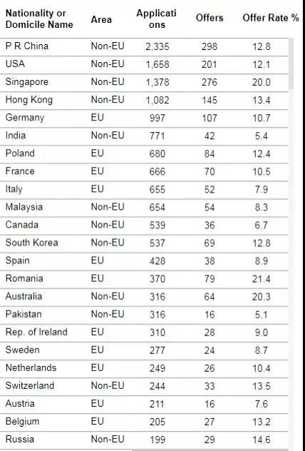 牛津本科发放录取比例地区统计