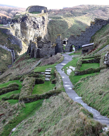 城堡挺立在岩石半岛的高台上,通过一条陡峭的栈道和桥梁和英国本土相连。英国作曲家巴克斯 (Arnol Bax)在参观过此地后,受到美丽景色和远古传说的深深感召,于1919年写下了交响诗《廷塔杰尔》。