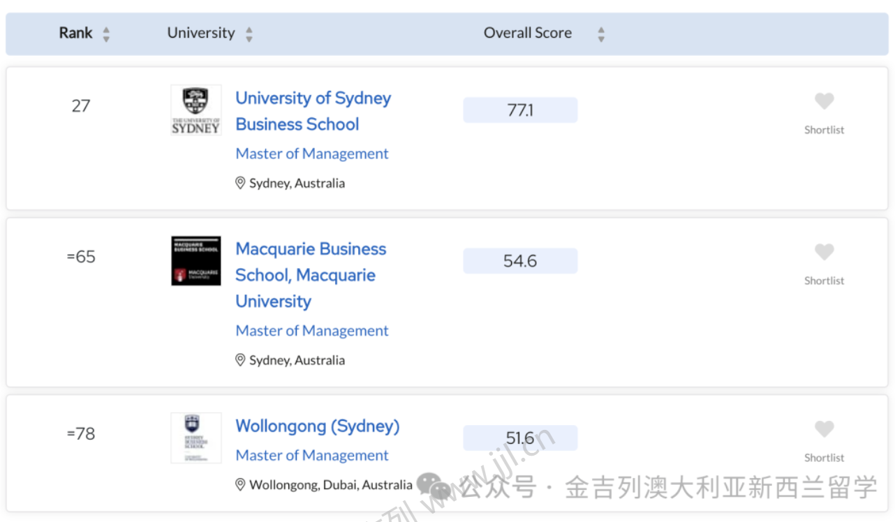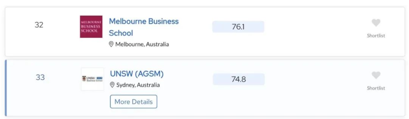 墨尔本商学院 是大洋洲排名最高的 MBA商学院,位列全球第32名 , 这是由于其 世界级的思想领导力指标 得分和该地区 最高的就业能力 得分以及 投资回报率 得分。 除此之外,悉尼大学商学院(University of Sydney Business School)、麦考瑞大学商学院 (Macquarie Business School)、悉尼科技大学商学院 (University of Technology Sydney Business School)等也分别在管理学、金融学各项排名中取得亮眼成绩。