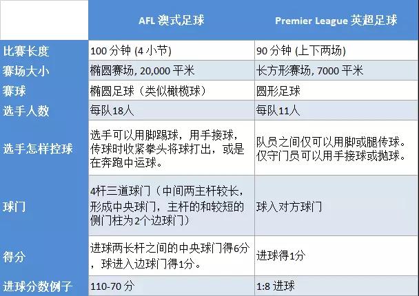 对于第一次观看澳式足球的观众,会感到不解,相比于普遍了解的英超Premier League,我们会发现: