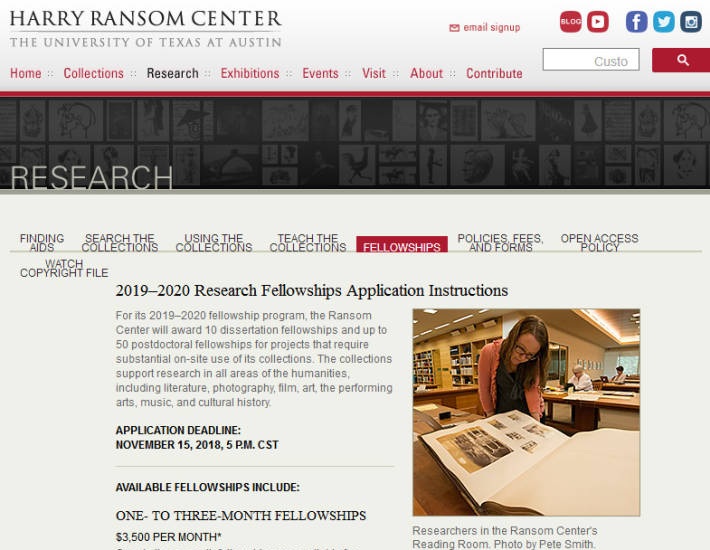 德克萨斯大学奥斯汀分校的Harry Ransom中心是一个国际知名的人文研究图书馆和博物馆,中心拥有并收藏了诸多优秀作家、艺术家的作品,是文学、摄影、电影、艺术及表演艺术专业学生的重要知识库。现中心开设2019-2020学年研究助学金项目,面向所有人文研究领域的学生。奖学金包括生活补贴4000美元/月(1-3个月)、差旅费2500美元、研究补助2500美元。要求专业为人文类专业,如文学、摄影、电影、艺术、表演艺术、音乐和文化历史;拥有PhD学位;不限国籍。申请截止日期:2018年11月15日