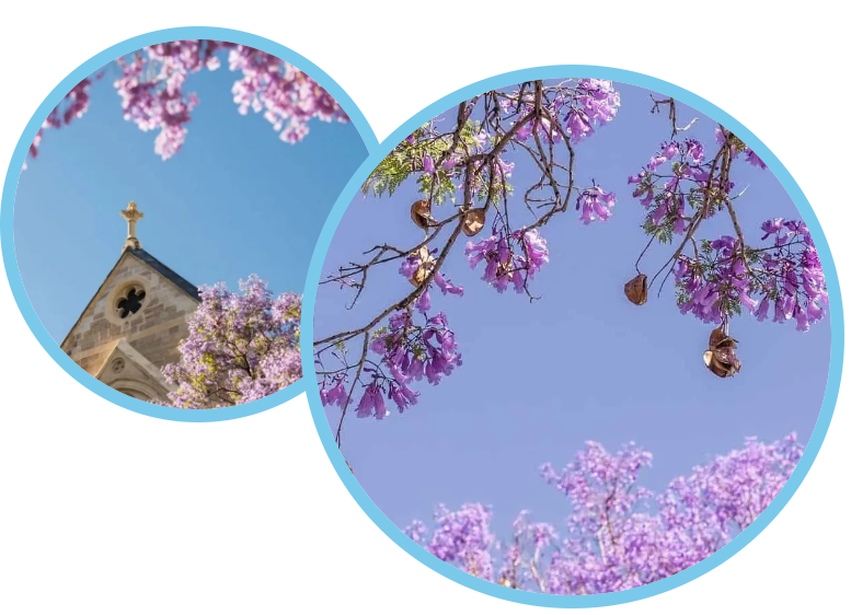 在阿德莱德大学的校园里,蓝花楹更是不可忽视的风景。每到花期, Bonython Hall 前的蓝花楹树静静绽放,宛如天然的艺术装置。在大学里,蓝花楹的盛开也被视为“考试季的开始”,给紧张的校园生活增添了一丝温柔和力量。