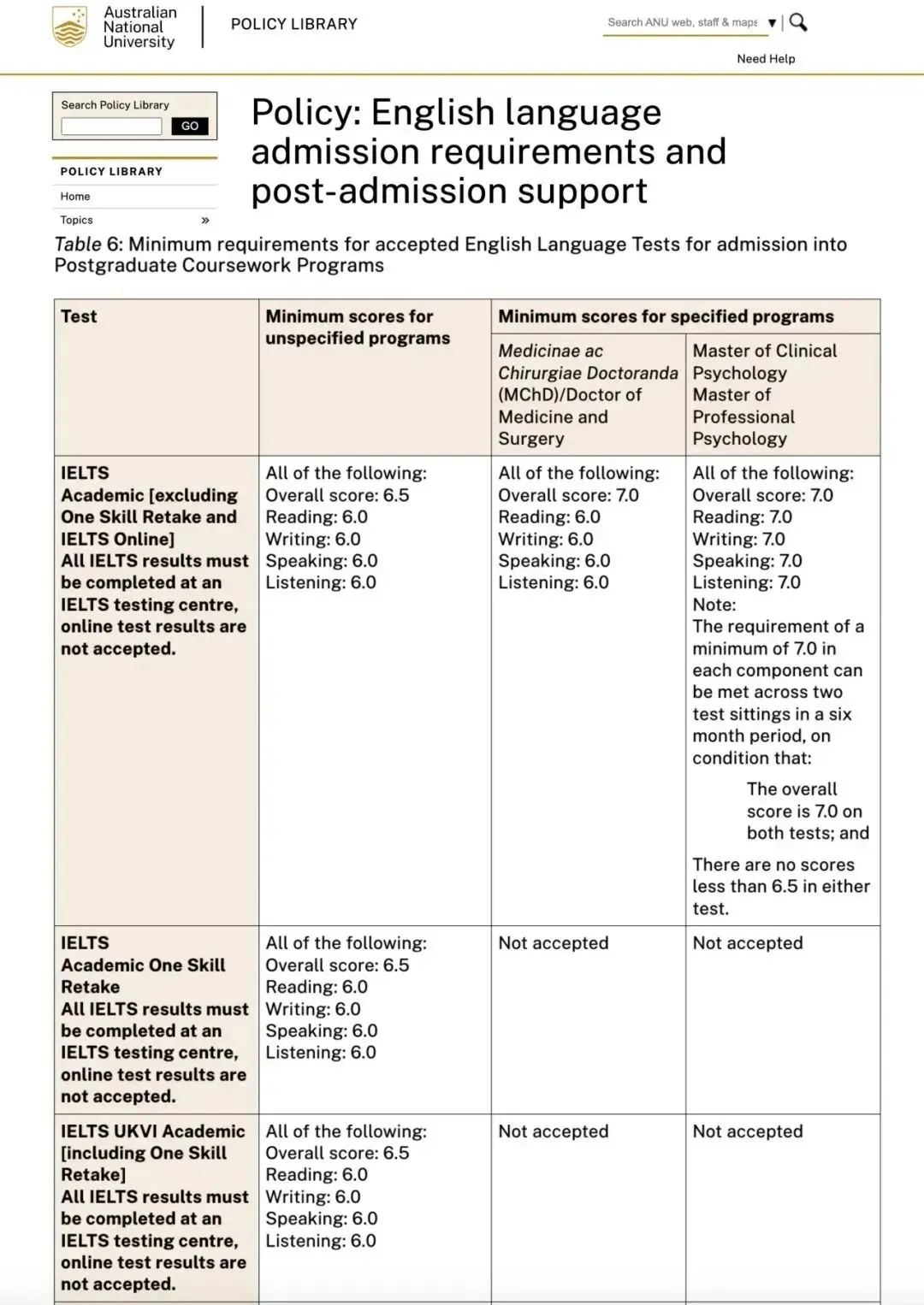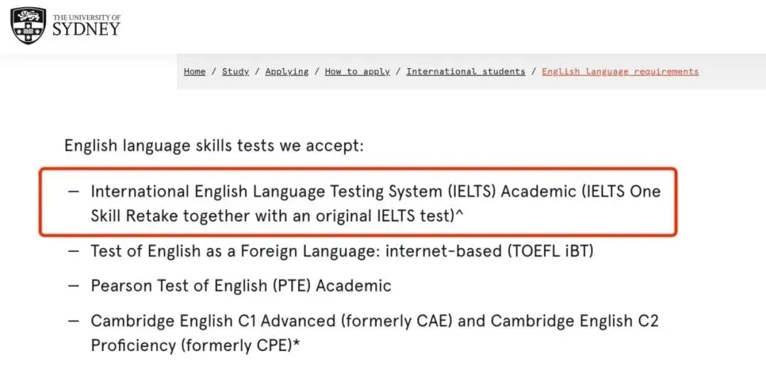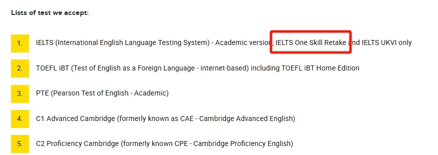 特殊要求:悉大的 IELTS 单项重考需与标准的 IELTS 测试一同评估。两年有效期适用于原始测试,而非 IELTS 单项重考的日期。