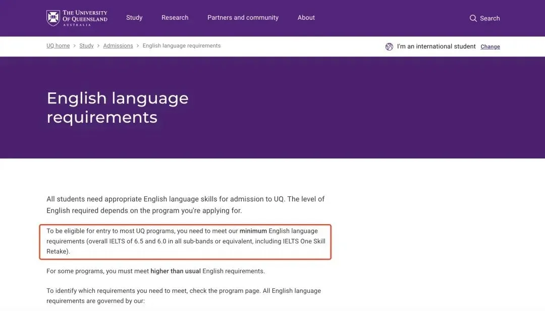 雅思:6.5(6.0),许多专业分数要求更高,达 7.0 以上。