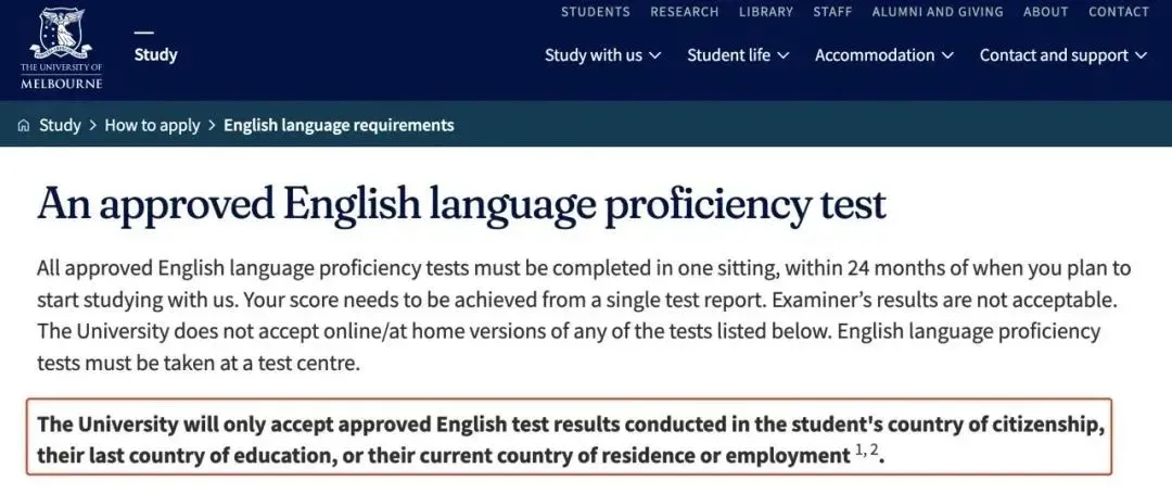 墨尔本大学语言要求卡得很死,暂不接受雅思单项重考,且不接受跨国语言成绩,要求国际申请者的语言成绩只能在原籍国,或 last 接受教育国,或目前居住、就业国考取,其他跨国考点获得的成绩将不被接受。