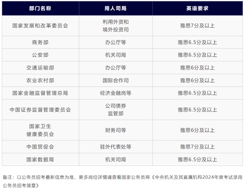 例如2024年国考公务员招考简章中,许多岗位都有雅思成绩要求,特别是一些涉外的工作岗位。