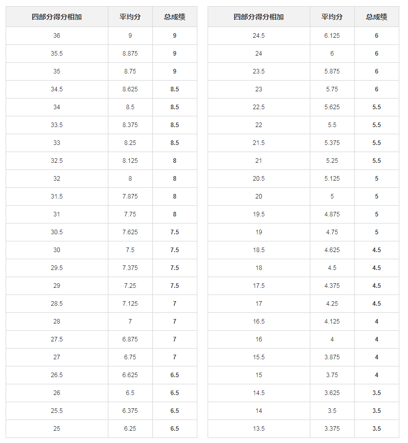 总分会以最接近的整分或半分报告:如果平均成绩的小数位是.25,就四舍五入到下个半分档;如果平均成绩的小数位是.75,就四舍五入到下一整分档。