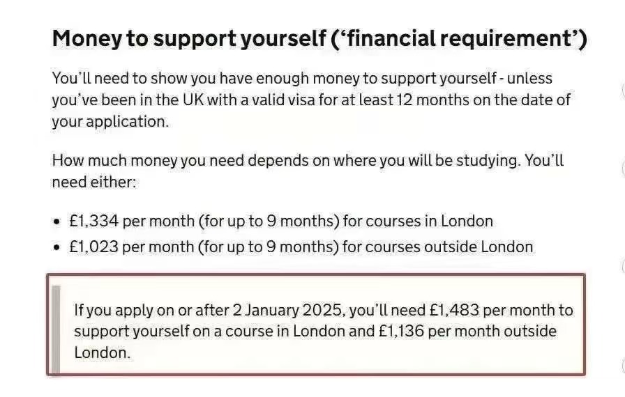 自2025年1月2日起,英国学生签证申请的担保金要求上涨 ·伦敦:每月需提供1483英镑担保金 ·非伦敦:每月需提供1136英镑担保