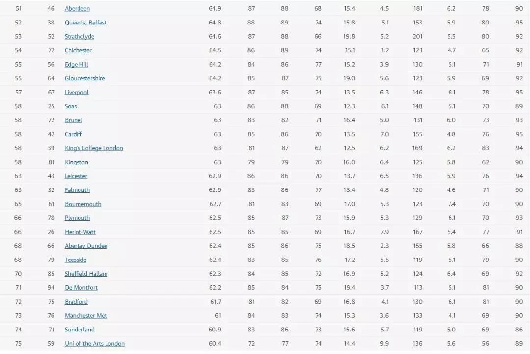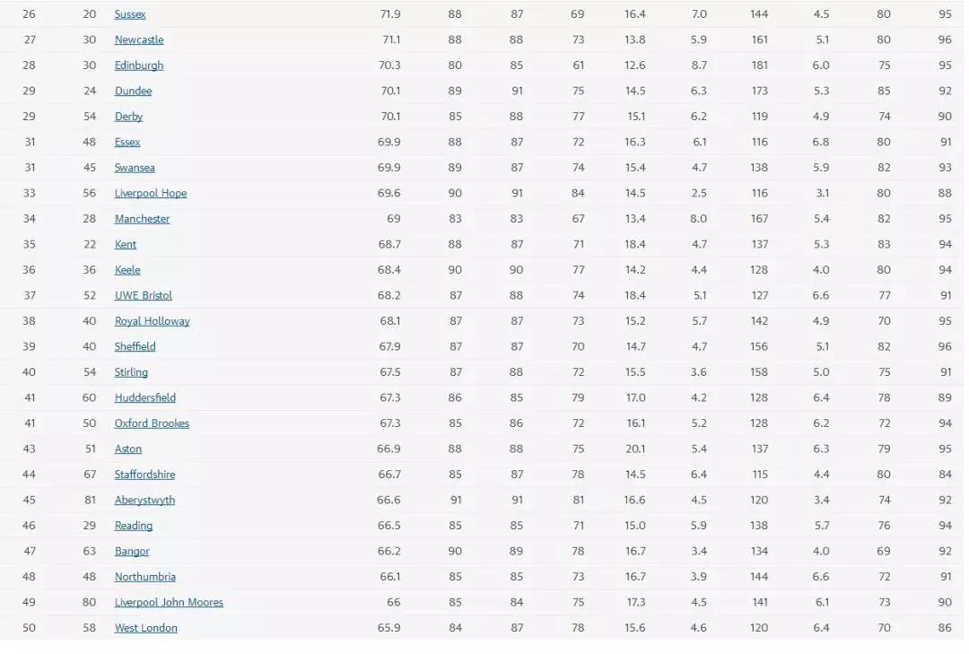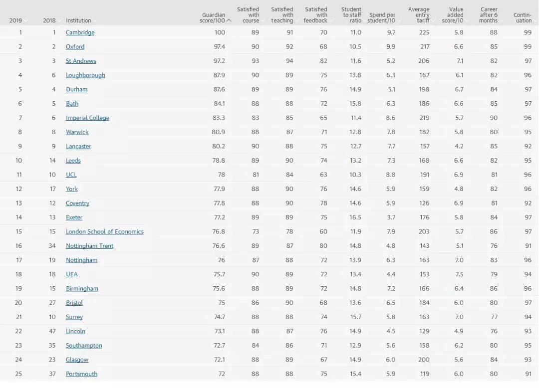 卫报的排名大家经常感觉到不可思议,是因为卫报的考察项目主要是按照 学生体验和教学效果 来排名,尤其是对于本科生和授课型硕士更有参考意义。