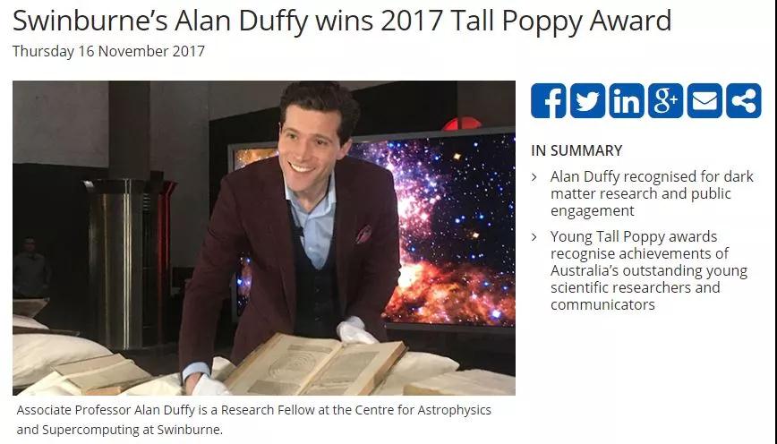 今年 3月,澳洲知名科研杂志 COSMOS 总结当今科研领域里 有望接过霍金 “衣钵”的明日之星 。 这其中就包括斯威本科技大学的教授 Alan Duffy 。如此的高颜值,而且年轻有为!