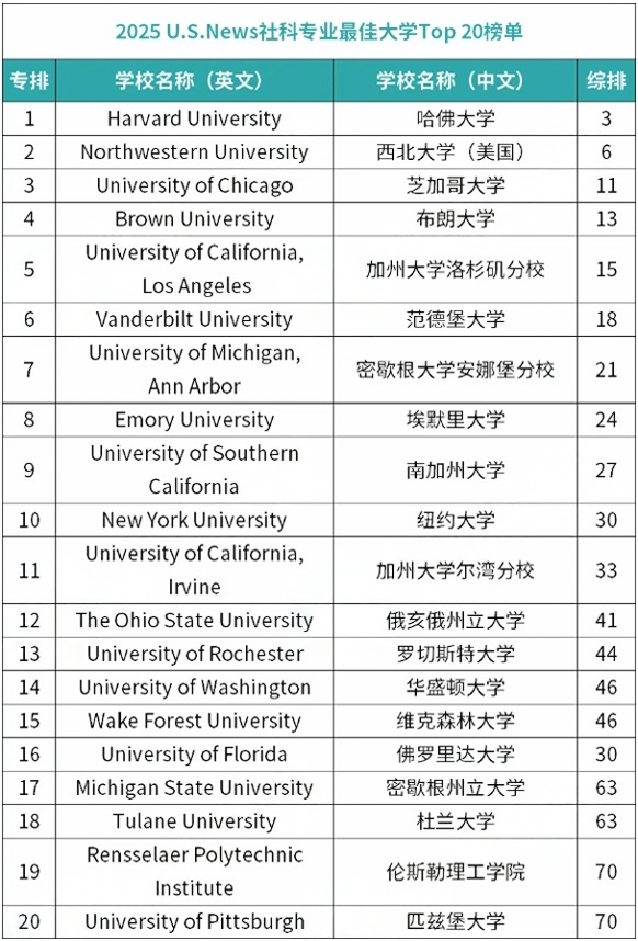 2025年QS世界大学排名社会学专业Top 20(美国院校):