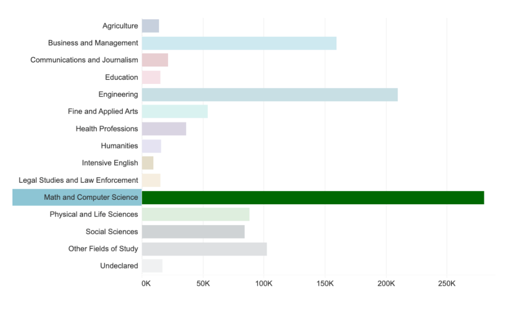 ,留学生专业分布中,数学&计算机专业的学生超过28万(光计算机专业人数就超过23万),是绝对的大头。在就业端,CS也是需求最旺盛的专业之一。