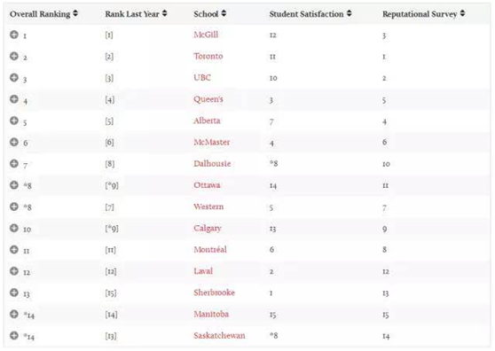 医博类的前 6 位和去年一样,总体排名没有发生变化,麦吉尔大学仍然是以相当的实力居于榜首,多伦多大学和 UBC 紧随其后,加拿大三大名校果真是名不虚传!皇后大学、阿尔伯塔大学和麦克马斯特大学分别位于 4-5 位。达尔豪斯大学由去年的第 8 位上升了一位,渥太华大学也由去年的第 9 位上升了一位,西安大略大学则由去年的第 7 名下降了一位和渥太华大学并列第 8 位。完整排名↓: