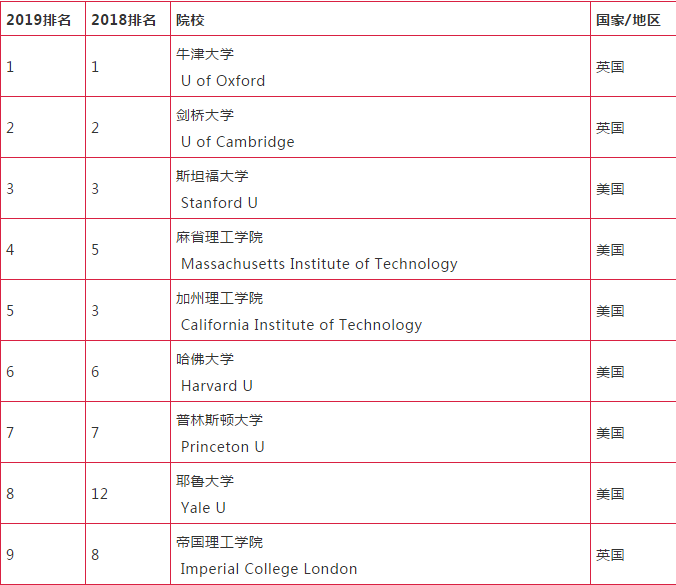 排名中,牛津大学连续第三年获得第一,同时在研究方面(数量、收入和声誉)高居榜首。剑桥大学保持第二,而美国斯坦福大学稳居第三。麻省理工学院名次上升一位至第四,但加州理工学院排名从去年的并列第三下降到第五位。耶鲁大学是前20名中名次提升最快的高校,较去年上升四名位列第八。