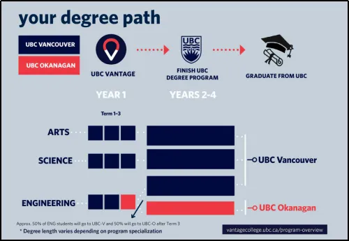 不同于其他双录取项目, Vantage 是将语言课程和大一学分课有机融合的强化课程,亮点:语言要求不高(雅思 5.5 起),且能在项目结束后与直录学生同期进入英属哥伦比亚大学大二。课程 8 月开启,时长 1 年,有三个学院方向可选,进入后是标准课程配置,第一年可以无忧选课。 Vantage 项目的学生反馈课程非常紧凑,为后续进入大二奠定了坚实的学术基础,学生真实体验评价度较高,喜欢温哥华的学生千万不要错过,弯道超车必备项目