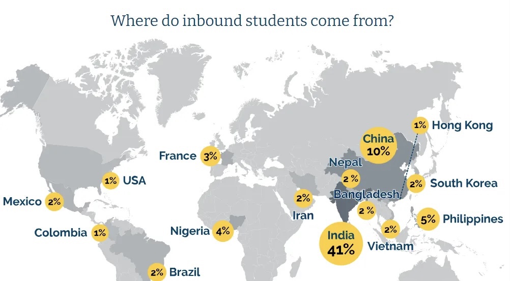 根据加拿大国际教育局(CBIE)的数据,截至2023年底,加拿大有超过100万国际学生,其中大部分是本科生。数据显示,印度、中国、韩国、法国等是加拿大主要的国际学生生源国。