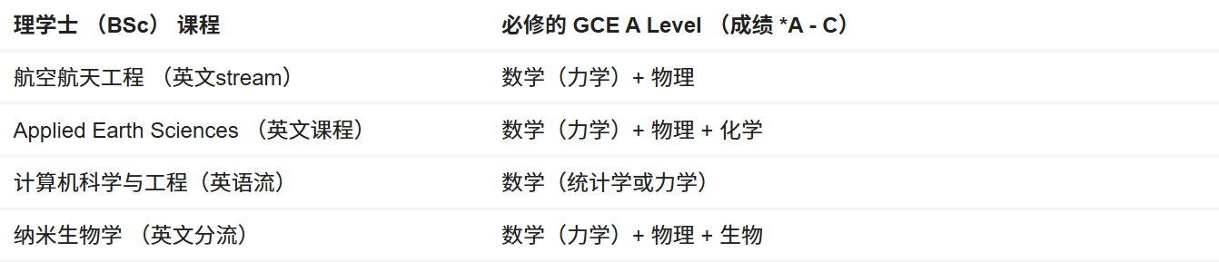 3门 (I)GCSE课程的分数达到C/4;3门 与申请领域相关的GCE 课程(学术)的分数达到C及以上;