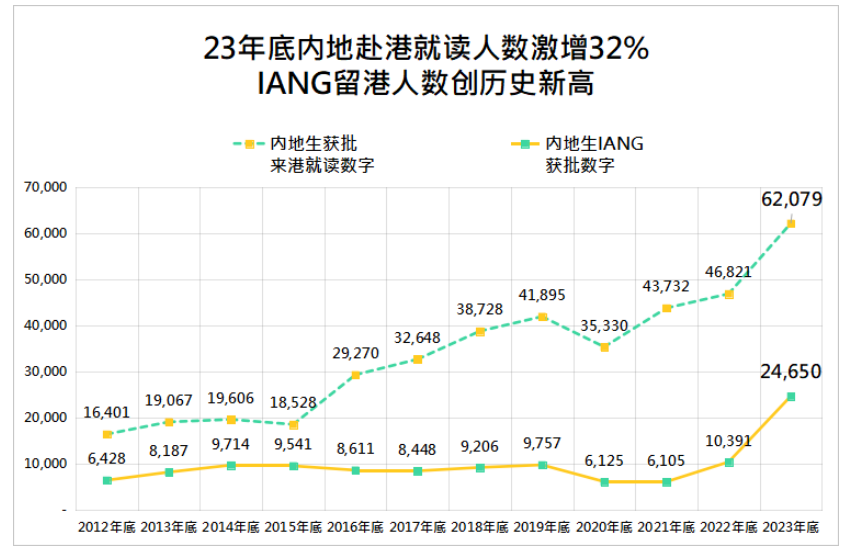 数据显示, 2023年底 内 地赴港就读的学生人数与上一年相比,同比激增了 32% ,增加了超过 8 万人 ,毕业后申请 IANG 留港签证的人数更是 增长了 137%。 香港高校的申请量持续攀升,竞争愈发激烈。