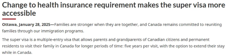 自2025年1月28日起,父母和祖父母申请加拿大超级签证时,可购买非加拿大保险公司提供的医疗保险,以满足医疗保险证明的要求。