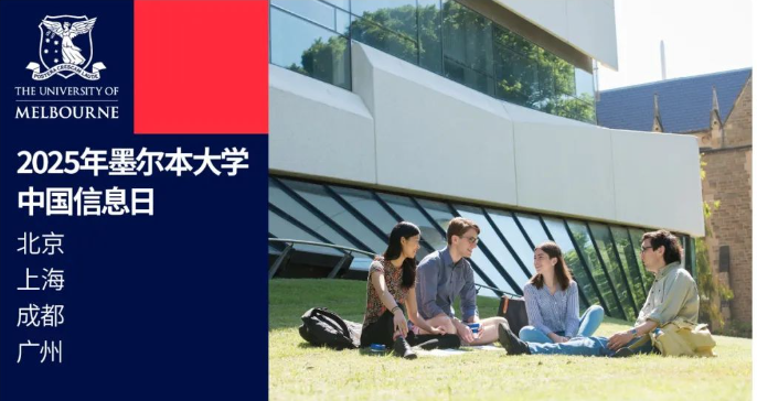 2025年3月15日至3月22日,墨尔本大学将在 北京 、 上海 、 成都 、 广州 举办 2025年墨尔本大学中国信息日招生系列活动 (2025 Meet Melbourne in China) 。