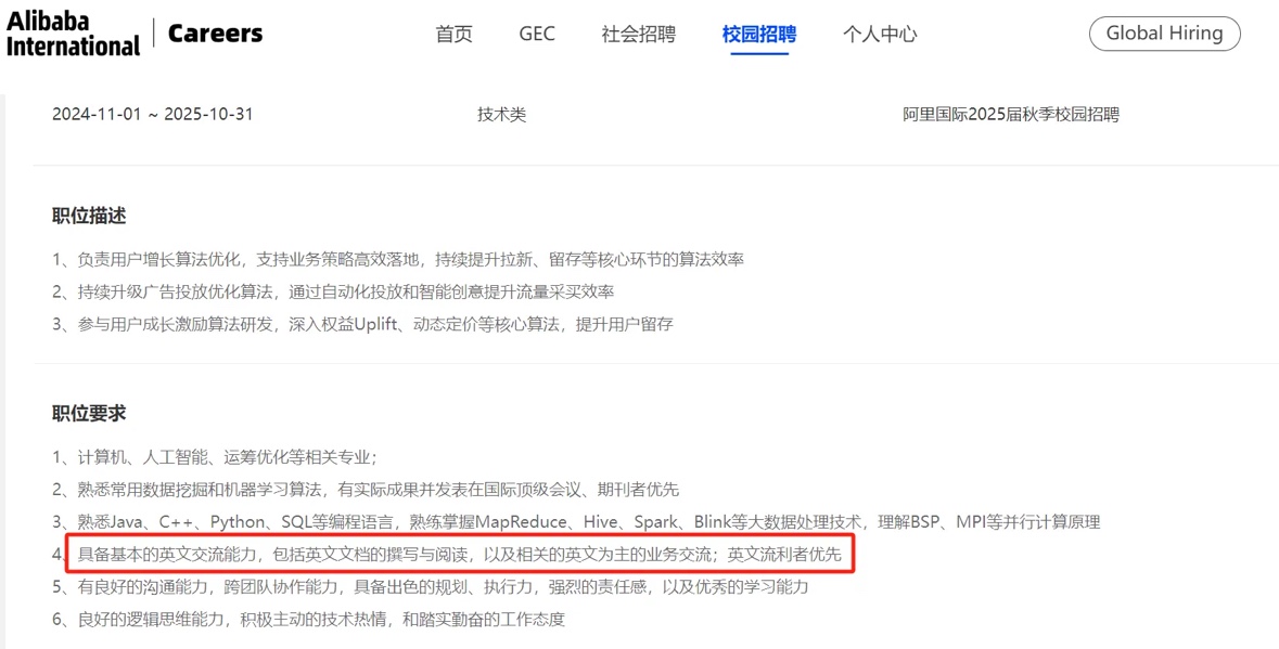 像其中阿里国际技术部门的算法工程师岗,就偏爱英语流利的同学。
