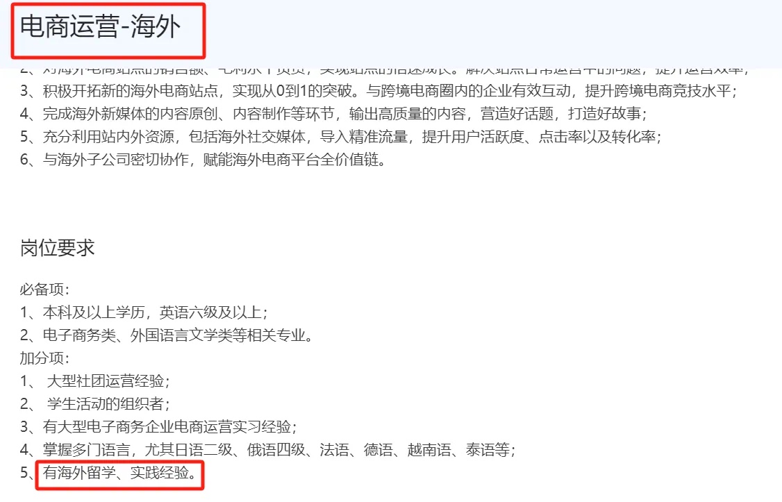 像其中国际事业部的电商运营岗位,就比较喜欢招有海外留学背景的同学。