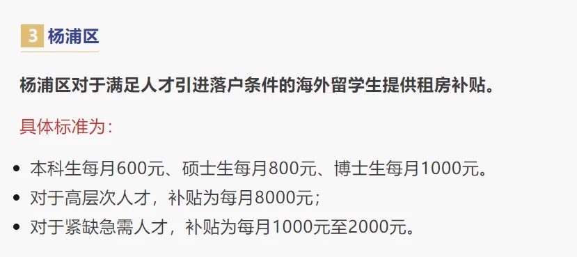 再比如杨浦区,满足人才引进落户条件的留学生,本科600元、硕士800元、博士1000元租房补贴,高层次人才甚至每月可拿到8000元。