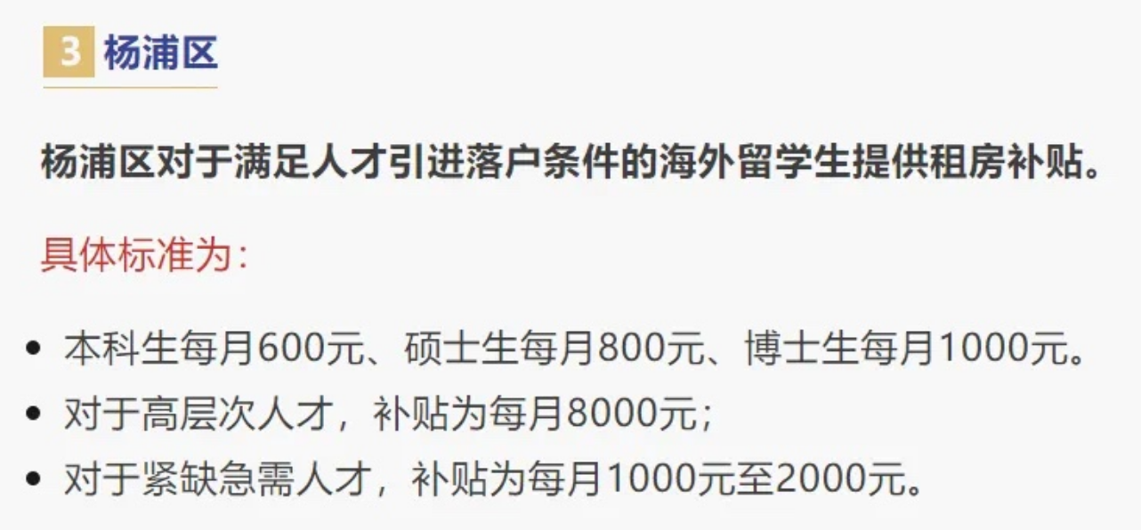 再比如杨浦区,满足人才引进落户条件的留学生,本科600元、硕士800元、博士1000元租房补贴,高层次人才甚至每月可拿到8000元。