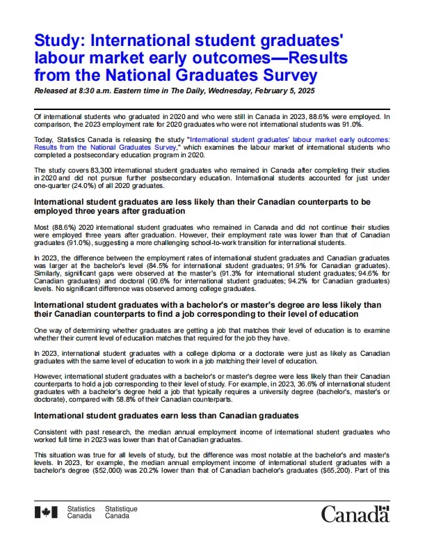 报告发布于2025年2月5日,加拿大统计局发布了该调查报告的研究中,调查了2020年完成高等教育课程的加拿大国际学生的劳动力市场状况。调查报告中,采集了涵盖83,300名国际学生毕业生数据,他们在2020年完成学业后留在加拿大,没有继续接受更高的高等教育,这些加拿大国际学生占2020年毕业生总数的近四分之一(24.0%)。