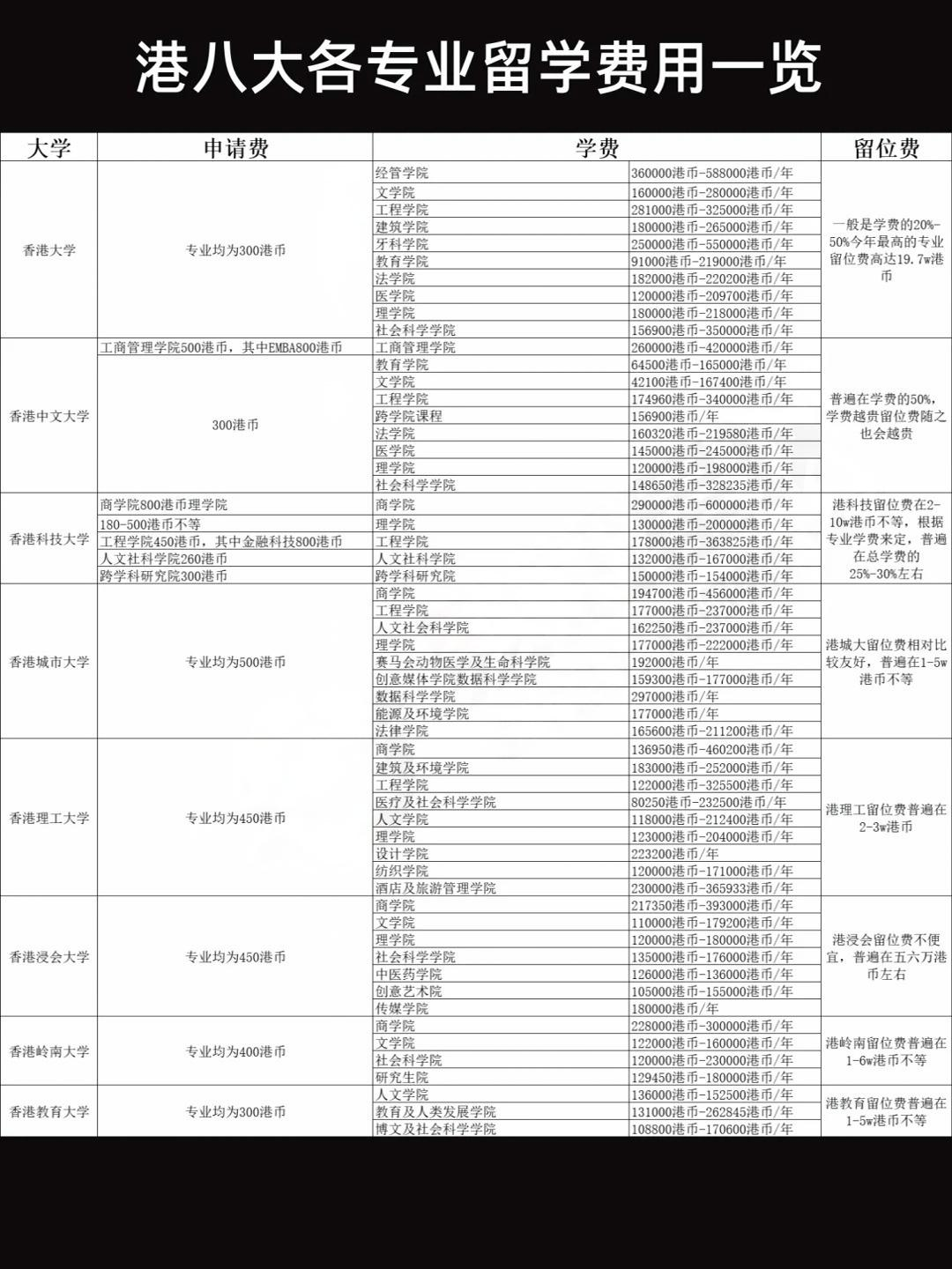 一起来看下港八大各学院的申请费、学费和留位费参考,具体还是要以官网为准哦~