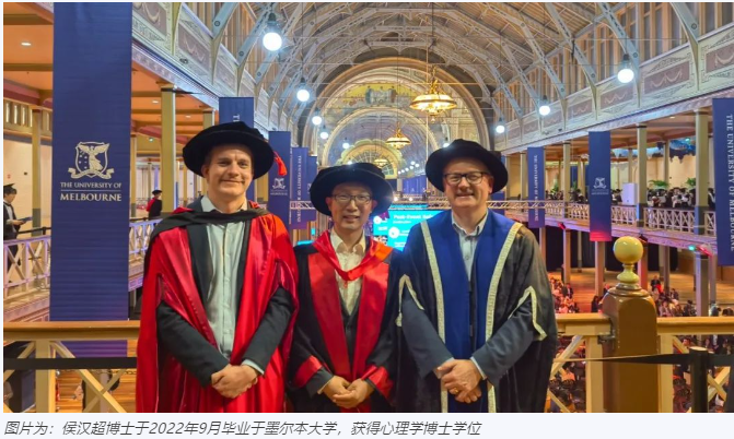 侯悍超博士 毕业于墨尔本大学, 研究方向为 积极心理学 。在墨尔本大学雄厚的学术资源支持和导师的悉心指导下,他不仅掌握了学术研究所需的核心技能和知识,还建立了全新的研究框架,为之后的研究奠定了坚实基础。