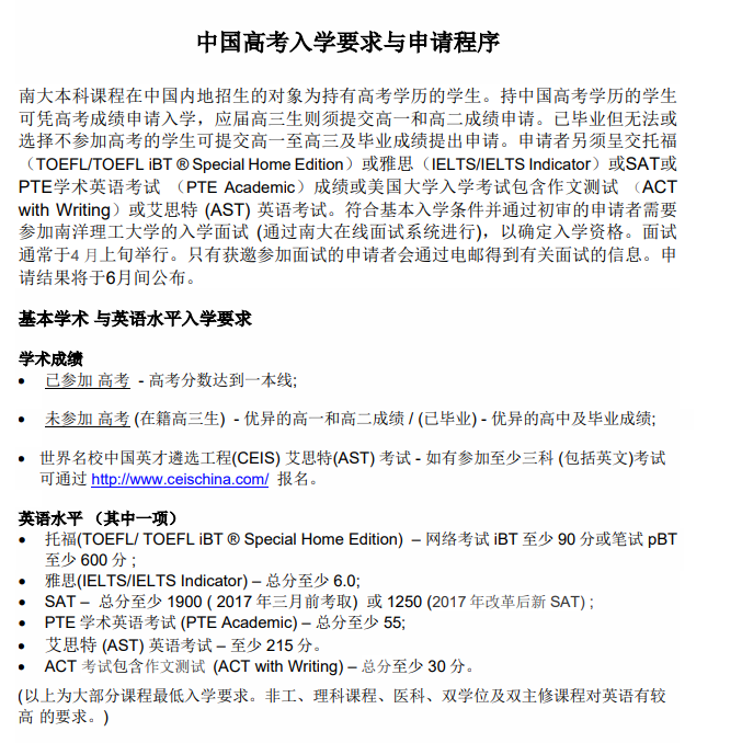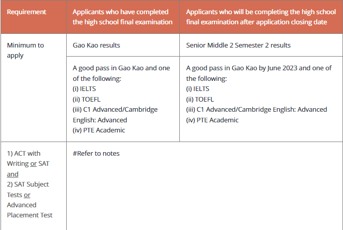申请人根据当前年级以及是否参加过高考,要求各不相同。新加坡国立大学允许提交在校成绩进行申请,但最终都必须提供相应的考试成绩: