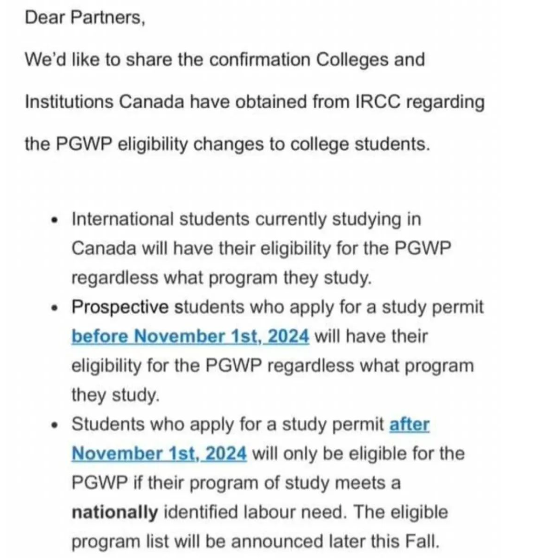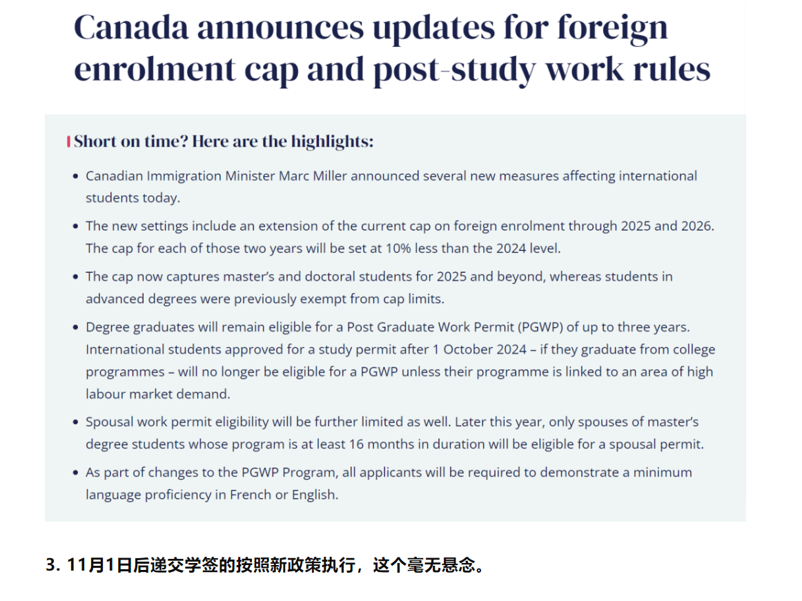 2. IRCC给的回复是2024年11月1日之前递交学签的申请人,毕业工签依旧按照你读的课程计算!