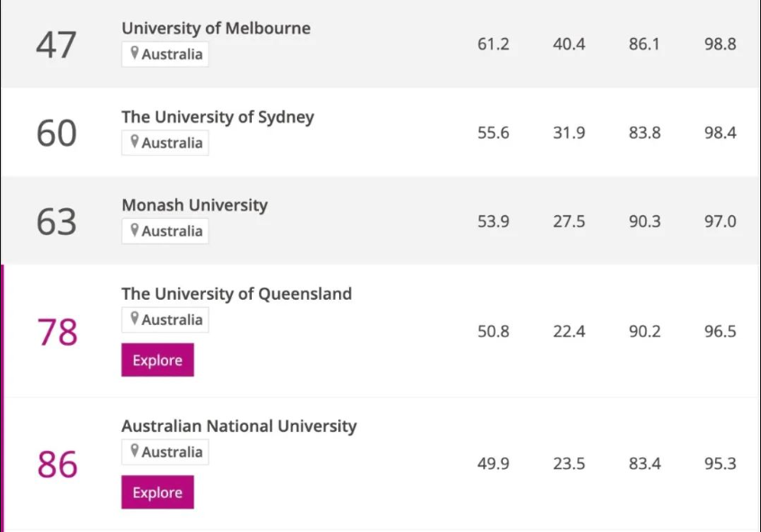 除此之外,昆士兰大学(78)、澳洲国立大学(86)、新南威尔士大学(97) 也统统杀进了百强!
