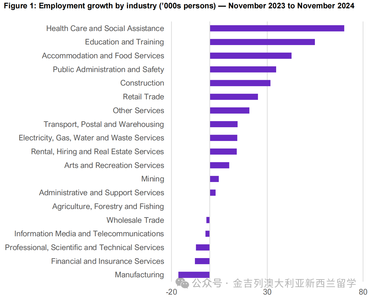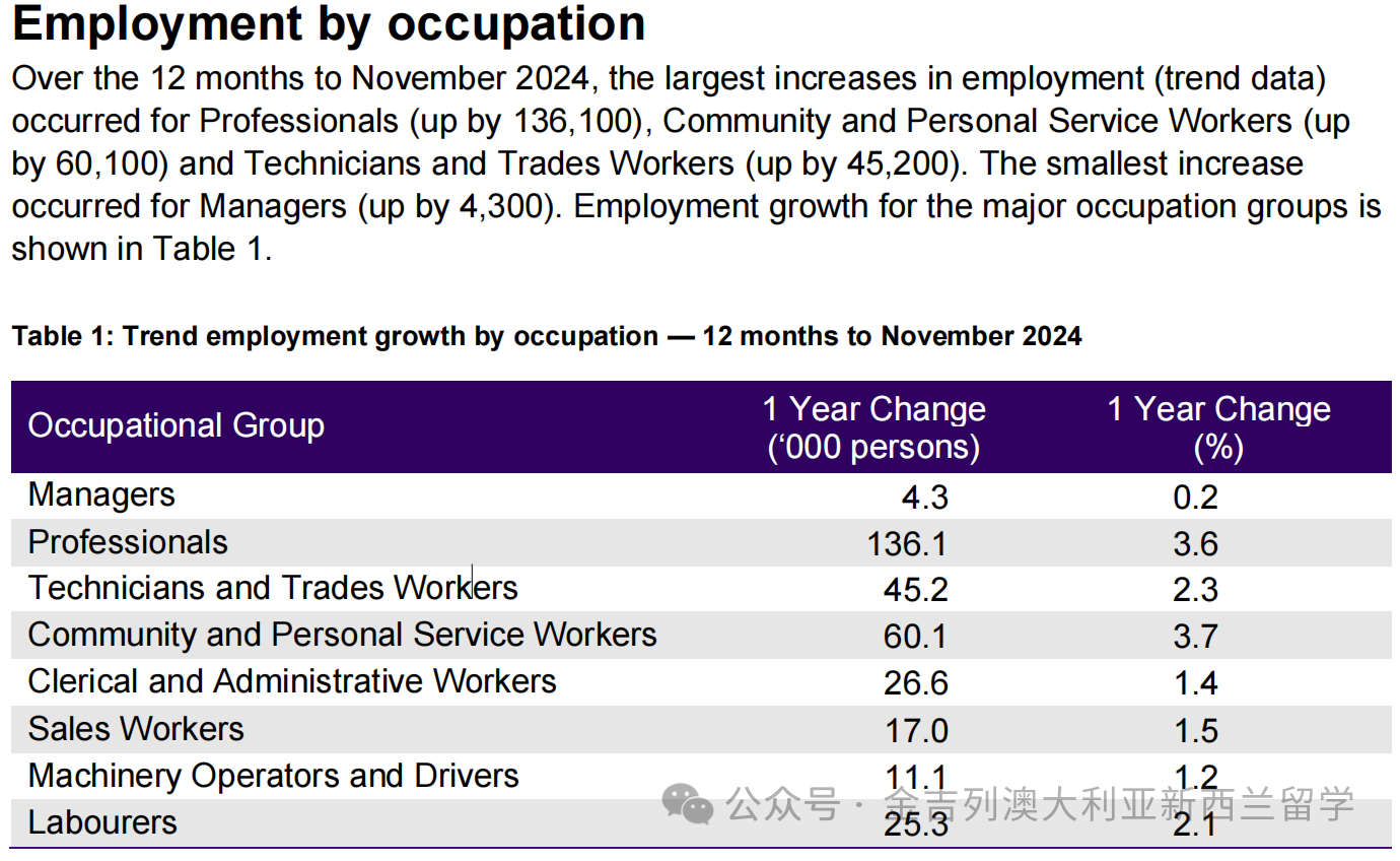 如果将澳大利亚的劳动力市场比作一片海洋,那么 医疗保健与社会援助行业无疑是近年来最汹涌的浪潮。 2023年11月至2024年11月,该行业新增就业岗位7.02万个,成为吸纳劳动力的最大赢家。紧随其后的是教育与培训行业(+5.49万人)和住宿与餐饮服务业(+4.27万人)。电力、燃气与水务行业则以8.0%的年增长率,成为增速最快的“黑马”。 这些增长背后,是澳大利亚社会深层次需求的体现。人口老龄化推动医疗护理需求激增; 国际学生回流与本地教育体系改革则让教育行业焕发活力。而住宿与餐饮服务的繁荣,则与旅游业复苏和消费习惯转变息息相关。