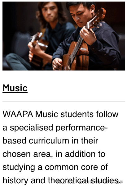 WAAPA被誉为南半球最顶尖的爵士乐学院,培养了无数在国际舞台上活跃的爵士艺术家。在这里你将学到即兴演奏、作曲与编曲的技巧,并有机会与世界级爵士乐手同台演出。每年WAAPA都会举办国际级的爵士乐盛会,为学生提供丰富的舞台经验。 学习过程中,WAAPA的爵士乐专业学生可以选择去美国纽约大学参加为期两周的暑期特训。